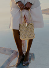 From the Plèi collection, which brings upcycled leather offcuts into play, the “Solé” bag blends innovation and artisanship. Made in France, the 240 pebble-like pearls are created using leather offcuts from other Polène collections. After being threaded onto waxed cotton, they are held in place by 120 hand-tied knots following a traditional macramé technique. This net-style bag is embellished with leather detailing for its stitched smooth leather base and handle. The name “Solé” is a play on the French word for “sun”, showcasing the summery vibe of this bag.